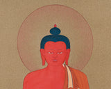 The Meditation Amitabha Buddha is a beautifully hand-painted thangka created on high-quality cotton canvas using vibrant acrylic colors and 24K gold accents. Each brushstroke is applied with devotion, depicting Amitabha’s glowing ruby-red figure seated on a blooming lotus. The natural colors add vibrancy to the flowers and offerings, while the delicate gold details enhance the halo and subtle highlights, creating a divine aura that gleams with sacred elegance. Painted in the traditional Karma Gadri style, this thangka showcases both artistic skill and profound spiritual symbolism.