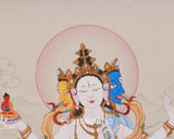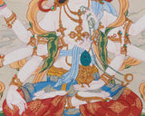This captivating Thangka portrays Namgyalma, the revered goddess of long life and purification, beautifully rendered in intricate detail. Hand-painted by skilled artisans, this sacred artwork serves as a powerful tool for spiritual practice, symbolizing victory over death and the attainment of enlightenment. Crafted on fine silk brocade, the small size makes it perfect for personal altars or meditation spaces, offering blessings of longevity and spiritual protection. An extraordinary piece of Dakini art from Nepal’s finest studio.