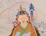 Guru Rinpoche, also known as Padmasambhava, holds a unique and unparalleled place in Tibetan Buddhism for his transformative role in introducing Vajrayana teachings to Tibet. Revered as the Lotus-Born Master, he is said to have miraculously emerged from a lotus flower, symbolizing purity, enlightenment, and divine wisdom. In this thangka, he is portrayed in a dynamic yet tranquil posture, embodying his power and compassion. His right hand holds a five-pronged vajra, symbolizing his control over nature's forces and his ability to eliminate ignorance. In his left hand, Padmasambhava holds a skull cup with a vase atop, representing the transmutation of worldly attachments into sacred offerings and the alchemical process of spiritual transformation.
