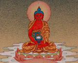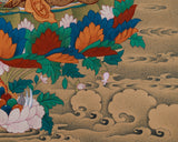 Guru Rinpoche, also known as Padmasambhava, is the revered founder of Tibetan Vajrayana Buddhism. Amitabha Buddha, the Buddha of Infinite Light and Compassion, is depicted above Guru Rinpoche to symbolize the inseparable union of wisdom and compassion. Together, they represent the ultimate goal of the spiritual path: awakening through enlightened guidance and boundless love. This thangka serves not only as a devotional piece but also as a meditation aid, illustrating the profound relationship between the master and the Buddha. Their combined depiction inspires practitioners to cultivate healing, protection, and enlightenment, making it a significant work of art in Tibetan Buddhist tradition.