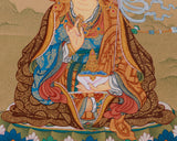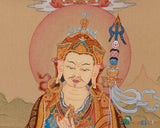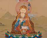 Our exceptional Guru Rinpoche with Amitabha Buddha thangka is meticulously hand-painted on premium cotton canvas using authentic natural Lhasa stone pigments and genuine 24K gold. The natural Lhasa stones are precious mineral pigments sourced from the Tibetan plateau, valued for their vivid, long-lasting colors and spiritual purity. Master artisans carefully grind and mix these pigments to create vibrant hues that bring the sacred imagery to life with unparalleled depth and luminosity. The 24K gold detailing is applied with precision to highlight divine features and sacred symbols, reflecting centuries-old Karma Gadri painting techniques renowned for their elegant compositions and delicate landscapes.