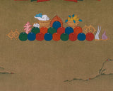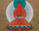 Amitabha wears a traditional monk's robe to symbolize his rejection of earthly attachments. He holds a monk's bowl in a dhyana mudra, signifying his commitment to simplicity and his role in providing wisdom for living beings. His feet feature Dharma Wheels, a revered symbol of his responsibilities as a teacher guiding individuals toward enlightenment. The thangka's background depicts a serene landscape with rolling hills and distant mountains, symbolizing Amitabha's Pure Land (Sukhavati), a realm free from suffering. This thangka serves as a powerful reminder of compassion, wisdom, and inner peace, making it ideal for a meditation space, altar, or sacred corner.
