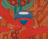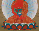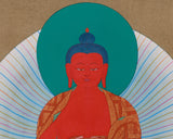 Pure Land Buddha Amitabha, known for his promise to welcome all beings into his Western Paradise, or Sukhavati, where they can continue their journey toward enlightenment. His ruby-red body symbolizes the fire of enlightenment, burning away ignorance and illuminating the path to wisdom. He embodies peace and calmness as he sits on a lotus seat in a meditative position. A moon disc and a glowing halo behind him emphasize his enlightenment and divine nature, representing his ability to dispel the darkness of ignorance. This Thangka is hand-painted on cotton canvas using high-quality acrylic colors and 24K gold to enhance its spiritual essence. It features delicate brushwork, soft color transitions, and a harmonious composition, showcasing Amitabha Buddha's divine presence in the traditional Karma Gadri style.