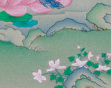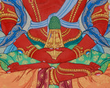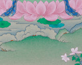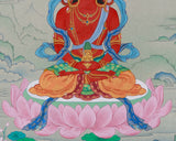 Amitayus, also known as the Buddha of Infinite Life, is a form of Amitabha associated with longevity, vitality, and compassion. He is often visualized in longevity practices aimed at prolonging life and removing obstacles to enlightenment. In this thangka, he is depicted with a radiant red body, seated in meditative stillness on a lotus seat, symbols of pure awareness and spiritual awakening. His hands rest in the dhyana mudra, holding a vase filled with the nectar of immortality, signifying the gift of eternal life and healing. He is adorned with a crown of five jewels, flowing scarves, and layered silk robes, all of which symbolize regal splendor and a state of enlightened tranquility. The halo behind his head and gentle green terrain enhance the peaceful atmosphere.