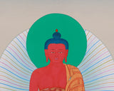 The Red Buddha Amitabha Thangka is a stunning Tibetan sacred art piece, hand-painted with vibrant acrylic colors and 24K gold. The traditional Karma Gadri style, known for its spacious compositions and fine detailing, is masterfully applied in this artwork. The vibrant acrylic colors create a dynamic quality, while the 24K gold accents add divine luminosity, symbolizing spiritual enlightenment. The Karma Gadri style emphasizes balance and harmony, making it a visually and spiritually compelling piece.