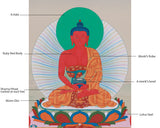 The thangka features Red Buddha Amitabha, symbolizing purity and enlightenment, on a lotus throne. His hands are in the Dhyana Mudra, a gesture of deep concentration. Amitabha's serene expression and radiant halo invite spiritual reflection. Flanking Amitabha are two bodhisattvas, representing wisdom and compassion, further enhancing the thangka's spiritual significance. This thangka beautifully captures the essence of Amitabha's compassionate and guiding presence.