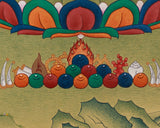 The Amitayus and Amitabha Thangka exemplify the remarkable artistry found in Tibetan Buddhist art. Created with natural colors derived from Lhasa stone and adorned with genuine 24K gold, the thangka beautifully embodies the themes of compassion, longevity, and spiritual enlightenment. The employment of Lhasa stone colors imparts an earthy yet vibrant essence, while the shimmering 24K gold highlights emphasize Amitayus's enlightened nature and divine connection. Made in the traditional Karma Gadri style, this Thangka follows meticulous Buddhist iconographic guidelines, thereby ensuring it remains a genuine spiritual offering.