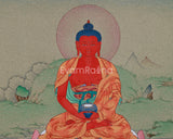 Amitabha Buddha is depicted in a glowing, ruby-red form, symbolizing spiritual purity and the energy of enlightenment. His hands are in a meditation gesture, holding a nectar bowl that signifies spiritual nourishment. The thangka artist has meticulously rendered every detail, emphasizing his gentle, compassionate face. This striking and balanced artwork serves as both a meditation tool and a beautiful devotional piece, ideal for inviting peace, protection, and compassion into any sacred space.