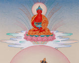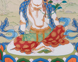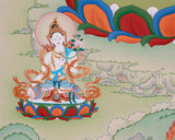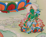 An extraordinary Chenrezig with White Tara and Green Tara Thangka, meticulously hand-painted on fine cotton canvas utilizing natural stone colors and embellished with genuine 24K gold. Executed in the distinguished Karma Gadri style, this masterpiece features refined details, subtle landscapes, and a luminous composition. The use of natural pigments ensures lasting vibrancy, while the gold accents highlight the sacred forms, giving the thangka an ethereal glow. Each brushstroke from our Enlightenment Studio embodies devotion and the centuries-old Tibetan artistic tradition.