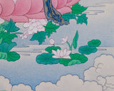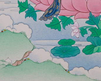 With a lotus blossom in her left hand and her right hand resting in a protective position, she bestows blessings on anyone who approaches her for advice. The thangka's background features a soothing mix of soft blues and greens, accented by delicate clouds that foster a tranquil and serene ambiance. She is seated on a lotus base, which is a representation of purity. The delicate lotus petals that surround her add to the painting's beauty. This spiritually powerful artwork is great for altars, meditation rooms, or anybody looking to evoke Tara's compassionate guidance and protective energy.