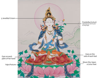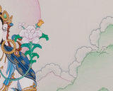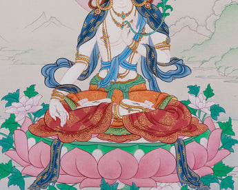 This Seven Eyes White Tara Thangka elegantly depicts the sacred presence of the goddess Tara, revered in Tibetan Buddhism for her boundless compassion and healing abilities. The seven eyes on White Tara's hands, feet, and forehead symbolize her omniscient knowledge and capacity to sense the pain of all sentient beings. She is regarded as the goddess of longevity and protection. Gracefully seated on a lotus seat, she is surrounded by lush greenery. Tara's expression is serene and pleasant, reflecting her nature as a compassionate figure. Her figure is brought to life with natural stone colors and 24K gold. The artist has meticulously painted the intricate patterns and fine decorations on her attire, incorporating gold accents in the traditional Karma Gadri style.