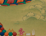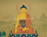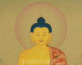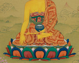 Created in the Karma Gadri style, this thangka follows the artistic traditions established by the Karma Kagyu school. Its gentle color palette and open layout encourage contemplation, allowing the viewer to form a deep connection with the central figure of Shakyamuni Buddha. Depicted in the Bhumisparsa mudra, the earth-touching gesture, the Buddha symbolizes his victory over the forces of Mara and his awakening and enlightenment under the Bodhi tree. His radiant yellow body and elongated earlobes represent his enlightenment and wisdom, while his robe signifies his renunciation of worldly pleasures and his commitment to spiritual liberation.