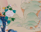 Created in our Enlightenment Studio, it is perfect for creating a sacred space or enhancing a meditation area. Its soothing colours and meticulous craftsmanship make it a beautiful addition to any spiritual setting. A traditional brocade frame can be customized, adding an extra touch of elegance and tradition.