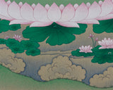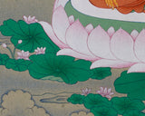 Executed in the Karma Gadri style, embodies the serene openness and refined simplicity of Tibetan art. The painting features a Buddha surrounded by lotus and misty mountains, creating a peaceful atmosphere that mirrors the infinite expanse of the enlightened mind. This stylistic approach enhances the contemplative quality of the Thangka, making it an ideal centerpiece for meditation or spiritual focus.