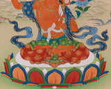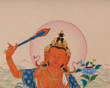 Immerse yourself in the profound wisdom of the Spiritual Art of Manjushri Bodhisattva, a captivating thangka made with dedication and precision. This sacred artwork beautifully combines the traditional artistry of Tibetan culture with modern workmanship, making it an inspiring addition to any spiritual space. The Thangka is meticulously painted on high-quality cotton canvas, using natural stone colors to achieve a rich, textured appearance. Genuine 24K gold accents add a luminous quality, reflecting light and creating a divine aura around the figure of Manjushri. The harmonious blend of materials highlights Manjushri's serene yet commanding presence.