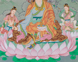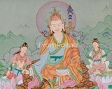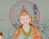 Accompanying Guru Rinpoche in this stunning thangka are his two principal consorts, Mandarava and Yeshe Tsogyal. They played essential roles in the spread of his teachings, and their serene expressions, along with their powerful presence, truly reflect their vital contributions to the transmission of wisdom and compassion. This painting serves not only as a beautiful work of art but also as a potent tool for meditation and fostering spiritual growth.