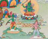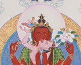 At the center of the thangka is Gyalwa Gyasto, the red manifestation of Avalokiteshvara (Chenrezig), depicted in a symbolic embrace that signifies the union of compassion and transcendent wisdom. This form, highly esteemed in Vajrayana Buddhism, embodies all Buddhas and is venerated in advanced meditation practices for cultivating bodhicitta—the awakened heart. With multiple arms holding traditional sacred objects, he exemplifies the infinite methods by which enlightened compassion manifests to liberate sentient beings. Seated on a lotus throne beneath Amitabha Buddha, who radiates divine light from above, Gyalwa Gyasto functions as the focal point of this visual mandala.