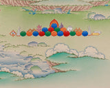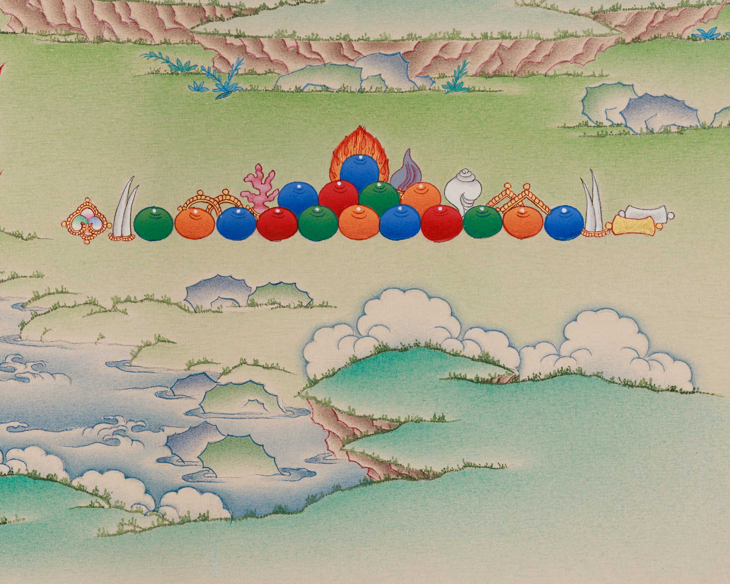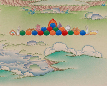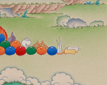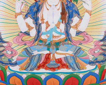 Our exquisite Four-Armed Chenrezig, the Compassion Buddha, is hand-painted on cotton canvas with natural stone colors and genuine 24K gold. These sacred materials bring the figures to life, with 24K gold providing a divine glow and natural stone colors adding deep textures that highlight the piece's spiritual meaning. Painted in the esteemed Karma Gadri style, this thangka is a genuine reflection of Tibetan artistic tradition, capturing the spirit of these influential Bodhisattvas.