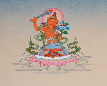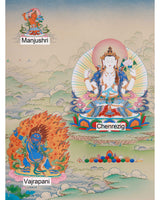 The central figure of Chenrezig, the embodiment of compassion, is depicted with four arms, symbolizing his ability to reach out and assist all beings in need. His calm expression and tranquil posture encourage viewers to feel his infinite love and mercy. Above Chenrezig, Manjushri, the Bodhisattva of wisdom, holds his sword of wisdom, signifying the cutting away of ignorance and the path toward enlightenment. At the bottom, Vajrapani, the fierce protector, stands vigilant, providing strength and protection for those on the spiritual path.