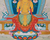 The Buddha of the Future, Maitreya, exemplifies divine spiritual insight, made on high-quality cotton canvas with vibrant acrylic paints and accented with 24K gold. It embodies both beauty and sacred energy. The natural shine of the 24K gold accentuates Maitreya's calm expression, celestial adornments, and the symbolic lotus throne. Meanwhile, the vivid acrylic colors add richness and life to the artwork. Created in the esteemed traditional Karma Gadri style, this painting harmonizes elegance, gentle beauty, and deep spiritual significance, making it a perfect addition to any sacred space.