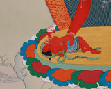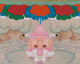 One of Vajrayana Buddhism's most potent manifestations is the Red Dakini Vajrayogini Thangka, which embodies the spirit of enlightened energy, wisdom, and transformation. This thangka is delicately hand-painted on high-quality cotton canvas using only the best acrylic colors to achieve vibrant and long-lasting colors. From the deity's complex facial expressions to the scene's dynamic motion, the artist has expertly layered the acrylics to produce rich tonal depth, giving each feature depth and vitality. The artwork's halo, jewelry, and other essential components are especially enhanced by the exquisite application of genuine 24K gold, which adds to the composition's spirituality and brightness. A thangka that combines high-quality materials not only exhibits remarkable artistry but also captures the spiritual meaning of the classic Karma Gadri style, which is renowned for its precise lines, harmonious composition, and profound symbolism.
