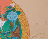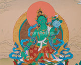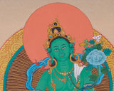 Our Tibetan Buddhist Deity Green Tara Thangka is a beautifully hand-painted artwork that embodies the divine energy of the Bodhisattva of Compassion and Protection. The cotton canvas provides a strong base for the intricate details, while the vibrant acrylic colors bring the artwork to life. Genuine 24K gold is used on key features, such as her halo, jewelry, and divine symbols, enhancing the sacred glow. The traditional Karma Gadri style focuses on balance, symmetry, and spiritual depth, making it a stunning example of Tibetan Buddhist artistry.