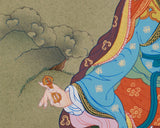 Guru Rinpoche, also known as Padmasambhava, is warmly honored as the teacher who introduced Buddhism to Tibet and is affectionately referred to as the “Second Buddha.” In this beautiful painting, he is peacefully seated on a lotus throne, wearing the traditional lotus hat and gently holding a vajra and skull cup—symbols of his strong wisdom and enlightened power. His calm yet powerful expression beautifully blends compassion and strength, inspiring practitioners and offering protection against obstacles. With its rich symbolism and skilled workmanship, this thangka painting is more than just art; it feels like a sacred presence, radiating blessings and guiding your spiritual journey.