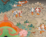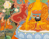 We have exclusively hand-drawn the Tibetan Shakyamuni Buddha Thangka in our studio. We have used cotton canvas and natural stone colors to depict the deity. The historical Buddha is portrayed in the center alongside his disciples. The disciples are making offering to the Buddha. He is seated on a moon disc lotus throne and has a tranquil expression. His left hand is in his lap, holding an alms bowl, while his right hand is making the mudra of the earth-touching gesture. You can use this thangka painting for various purposes, such as in your regular meditation, Buddhist rituals, and even home décor. We also have used genuine 24K gold to further highlight the deity's features and as a finishing touch.