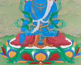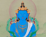 Buddha Mitrupa, also known as Akshobhya, is a key figure in Tibetan Buddhism, symbolizing serenity, wisdom, and spiritual resolve. His name, meaning "Immovable" or "Unshakable," signifies his ability to transform anger into wisdom. This hand-painted thangka, made from 24K gold and natural stone colors, embodies spiritual depth and artistic excellence.