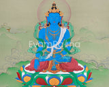 In traditional thangka art, Mitrupa is depicted in a Vajra posture, symbolizing stability and spiritual firmness. His right hand touches the earth in the Bhumisparsha Mudra, symbolizing his unwavering commitment to enlightenment and victory over obstacles. His deep blue body signifies infinite space, purity, and wisdom. He is associated with the eastern direction and the element of water, representing calmness and clarity. His spiritual realm is Abhirati, a paradise of joy and bliss for those seeking awakening through meditation. Displaying a Buddha Mitrupa thangka in a sacred space promotes inner peace, stability, and clarity of mind, highlighting resilience and the potential to overcome life's challenges.