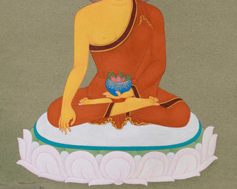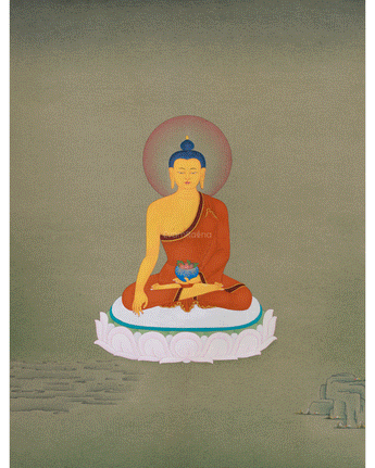 Experience the peaceful presence of the traditional Buddha Shakyamuni artwork, a sacred piece hand-painted in our Enlightenment Studio. Made on high-quality cotton canvas with acrylic colors and 24K gold, this thangka emits spiritual energy and visual brilliance. The acrylic colors add vibrant clarity to every detail, while the gold accents highlight the Buddha’s divine presence. Created in the traditional Karma Gadri style, known for its precise lines and balanced layout, this thangka showcases centuries of Tibetan sacred artistry and devotion.