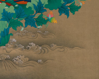 Hand-painted with care in our Enlightenment Studio, this beautiful Padmasambhava artwork is a remarkable 40 x 50-inch thangka, created on fine cotton canvas with vibrant acrylics and 24K gold. The lively colors add clarity and depth, while the gold details make each sacred symbol shine with a celestial glow. The Karma Gadri style, known for its elegant lines, spacious layouts, and calming palette, brings a sense of harmony and grace to the piece. Every brushstroke shows skill, devotion, and spiritual purpose—making this artwork not just a stunning visual but a heartfelt expression of enlightened energy and blessings.