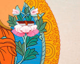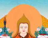 The Kathmandu Valley artist has traditionally hand-painted this exquisite thangka of Tsongkhapa, Tibetan Buddhis Master in Karma Gadri Style. He is seated atop a moon disc lotus seat with a serene expression. The orange halo is illuminating his face while the blue nimbus encircled with a pure gold color is engulfing him. He is holding the Lotus (utpala) in both hands-on which. The wisdom book on the left and the burning sword on the right are placed on top of the Lotus.