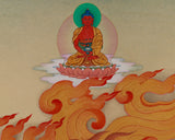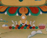 Vajrapani, Shakyamuni Buddha's protector, is a potent symbol of spiritual strength and Dharma protector. Using natural Lhasa stone hues, this magnificent thangka is skillfully hand-painted on high-quality cotton canvas and embellished with genuine 24K gold. This artwork, created in the traditional Karma Gadri style, follows the guidelines in the traditional meditation manual, ensuring authenticity and spiritual depth. With Amitabha Buddha reclining above as a sign of enlightenment, this thangka embodies the ideal combination of protection and knowledge.