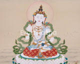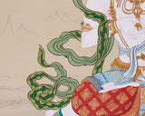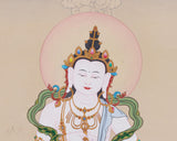 Step into a realm of divine purity and enlightenment with this exquisite hand-painted Thangka of Vajrasattva with Amitabha Buddha. Expertly made on premium cotton canvas using vibrant natural stone pigments and genuine 24K gold, each detail radiates celestial brilliance. The use of these sacred materials is rooted in Tibetan Buddhist tradition, with natural stone hues creating rich textures and 24K gold highlighting the spiritual radiance of the Buddhas. Created in the esteemed Karma Gadri style, this Thangka embodies the essence of transformation and divine wisdom, serving as a timeless symbol of spiritual awakening.