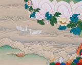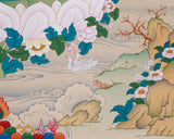 At the top of the Thangka, Amitabha Buddha sits in peaceful meditation, radiating limitless compassion and wisdom. Below him, Vajrasattva, the deity of purification, holds the vajra and bell—symbolizing the power to remove negativity and guide one toward spiritual clarity. Amitabha is honored for leading souls to the Western Pure Land of Sukhavati, where the path to enlightenment is lit, while Vajrasattva’s purifying energy clears obstacles on the spiritual journey. The union of these two influential figures in one thangka beautifully symbolizes the harmonious blend of wisdom and purification. It offers a heartfelt blessing of peace, clarity, and transformation to all who seek enlightenment, inspiring a sense of hope and serenity.