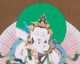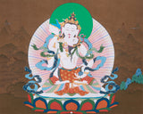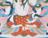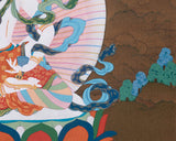 This beautifully hand-painted thangka illustrates Vajrasattva with his consort. Made on cotton canvas, it employs acrylic colors and incorporates genuine 24K gold embellishments. Painted in the elegant Karma Gadri style, it presents an open composition with a gentle earth-toned background and smooth color transitions. The vibrant colors and delicate golden details amplify the tranquility of the central figures, while the subdued mountain and cloud backdrop contributes a sense of spiritual depth. Each brushstroke reflects the artist's meticulous technique.