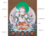 At the core, Vajrasattva, representing purity and the transformative force of wisdom, is depicted in a sacred embrace with his consort. This union signifies the non-duality of wisdom and method- view and compassion- which are vital aspects of Vajrayana practice. Vajrasattva's tranquil white form embodies untouched clarity, free from impurities. He wears a crown adorned with five jewels, flowing silk scarves, golden earrings, and armlets, highlighting his enlightened nature. In his right hand, he holds a vajra (thunderbolt) at his heart, symbolizing unbreakable wisdom, while his left hand gently cradles a bell, representing the essence of emptiness and ultimate truth.