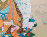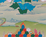Explore the sacred realm of Tibetan Buddhism with this stunning Vajrayana Master Guru Rinpoche thangka. It is hand-painted with vibrant acrylic colors on high-quality cotton canvas, capturing every detail of this revered spiritual figure. Genuine 24K gold accents add divine radiance, bringing Guru Rinpoche's powerful presence to life. The traditional Karma Gadri style enhances the thangka’s depth and clarity, making it both a visual delight and a spiritual treasure.