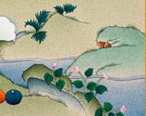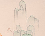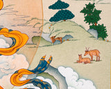 Our artist has painted White Tara with Amitabha Buddha Thangka, also known as Long LIfe Boddhisattva, in a natural ambiance with green hills, trees, and flora representing the serenity of her presence. She is seated on a lotus with the jewel-studded diadem. Behind her vibrant Halo is a transparent nimbus complementing her elegance, and above is the seated red figure of Amitabha Buddha in a lotus seat. Below her are offering Goddesses, and every tiniest detail is painted exquisitely.