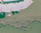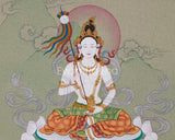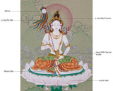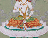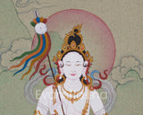 In this sacred artwork, Mandarva meditates serenely on a blooming lotus seat and moon disc, symbols of purity and spiritual clarity. Her right hand holds a mirror stick with five-colored silk ribbons, reflecting wisdom and the five elements. In contrast, her left hand cradles a vase filled with celestial nectar, representing healing and immortality. She is adorned with a five-jeweled crown, elegant silk garments, and golden ornaments that sparkle with the blessings of enlightenment. This spiritual treasure is perfect for meditation, display, or collecting.
