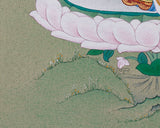 The wisdom and grace of Mandarva, the enlightened consort of Padmasambhava, are painted in this exquisite compact thangka. Made on fine cotton canvas using natural stone colors and adorned with genuine 24K gold, it follows the Karma Gadri style. Soft landscapes, spacious composition, and delicate brushwork come together to showcase Mandarva's spiritual power and peaceful energy.