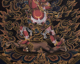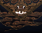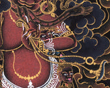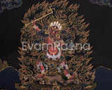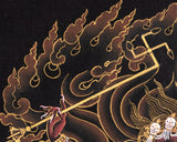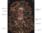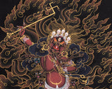 The Thangka prominently showcases the Wrathful Deity Ekajati, who is characterized by her single eye, tooth, and breast, symbolizing her unique and concentrated strength. The painting features a striking contrast of dazzling 24K gold against a deep black background, which highlights her fierce expression and dynamic posture. Every detail, from the textures of her body to the intricate patterns of her ornaments and weaponry, is rendered with precision. The acrylic colors are thoughtfully chosen to enhance the visual impact, using shades that add depth and vibrancy to her formidable form.