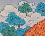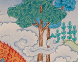 Mahakala is shown as a wrathful yet compassionate figure, surrounded by a fiery aura that symbolizes his spiritual power and ability to remove negativity. His fierce gaze, multiple arms, and sacred objects, including the curved knife, trident, and damaru, symbolize his dual role as a destroyer of harmful forces and a protector of the Dharma. Mahakala sits on a lotus seat upon a moon disc, surrounded by clouds and trees, representing purity and enlightenment within unstable surroundings. Each aspect inspires meditation, strengthens resilience, and guides practitioners toward liberation from internal and external forces obstacles.