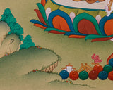 Yeshe Tsogyal is revered as the enlightened consort of Guru Rinpoche (Padmasambhava) and one of the most significant female figures in Tibetan Buddhism. Admired for her unwavering devotion, profound wisdom, and pioneering role in establishing Vajrayana teachings in Tibet, she embodies the union of compassion and spiritual realization. At the top of the painting, Amitabha Buddha represents infinite light and boundless compassion, serving as the ultimate source of enlightened blessings. Their combined portrayal symbolizes the inseparable unity of wisdom and compassion, illustrating how Yeshe Tsogyal’s enlightened feminine energy is supported and illuminated by Amitabha’s divine presence. This pairing inspires practitioners to cultivate both deep insight and heartfelt devotion on the path to awakening.