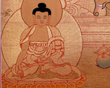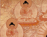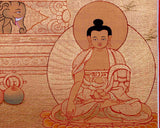 A complete 24k gold style Medicine Known also as Bhaisajyaguru or the "Healing Buddha," the Medicine Buddha is shown in the Buddha Thangka, a traditional Tibetan Buddhist painting. Rich colors and complex details are painstakingly hand-painted on this thangka, which also features a gorgeous 24k gold leaf background. In the middle of the picture, the Medicine Buddha is shown, surrounded by other Buddhist deities and symbols that stand for compassion and healing. It is thought that looking at the Medicine Buddha Thangka can help one connect with their own inner healing and find relief from bodily and mental pain, making it a potent instrument for meditation and spiritual practice. The 24k gold leaf gives this already stunning piece a touch of luxury and majesty.