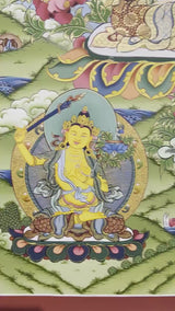 Flanking Chenrezig are Medicine Buddha and Shakyamuni Buddha, representing healing and enlightenment respectively, offering inspiration and guidance to practitioners. At the bottom, Bodhisattvas Manjushri and Vajrapani symbolize wisdom and spiritual strength, supporting the path of awakening. This Chengrezig thangka serves as a visual aid for meditation and contemplation, invoking the qualities of compassion, wisdom, and healing. Practitioners use this sacred art for devotional practices, altar adornment, and healing rituals, fostering a deeper connection with the enlightened qualities embodied by these revered figures in Tibetan Buddhism.