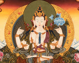 Chenrezig, also known as Avalokiteshvara, is a revered bodhisattva in Mahayana Buddhism, especially in Tibetan Buddhism. He embodies boundless compassion and is depicted with multiple arms and eyes. The mantra "Om Mani Padme Hum" is associated with him. He's central to Tibetan Buddhist practice, symbolizing compassion and wisdom.