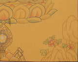Amitayus Buddha is a highly admired figure in Mahayana Buddhism, particularly in the Pure Land tradition. In this particular thangka, he is portrayed in concentration, carrying a vessel of immortality in his left hand. His right hand is resting in blessings, representing his bestowal of long life, health, and spiritual vitality. The yellow background in these paintings is noteworthy because it has deep symbolism in Buddhist artwork, indicating wisdom, enlightenment, and good fortune. Yellow is related to the sun, which represents warmth and vitality. The thangka provides a serene and auspicious visual mood that invites viewers to reflect on Amitayus' infinite compassion and eternal life.
