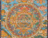 The mandala's concentric rings, surrounded by intricate patterns and designs that symbolize the cosmos, showcase deities in various positions, including seated Buddhas and Bodhisattvas. While the vivid color palette, which is dominated by tones of blue, gold, and red, gives the artwork an ethereal feel, the background's formation of clouds, mountains, and monasteries strengthens the celestial and religious concept. Inviting reflection and spiritual practice, the Tibetan script symbols and mantras written along the border further link the artwork to its ritual importance. Protective deities and other heavenly individuals are shown in the mandala's outer realms, which serve to protect the sacred area from outside influences.